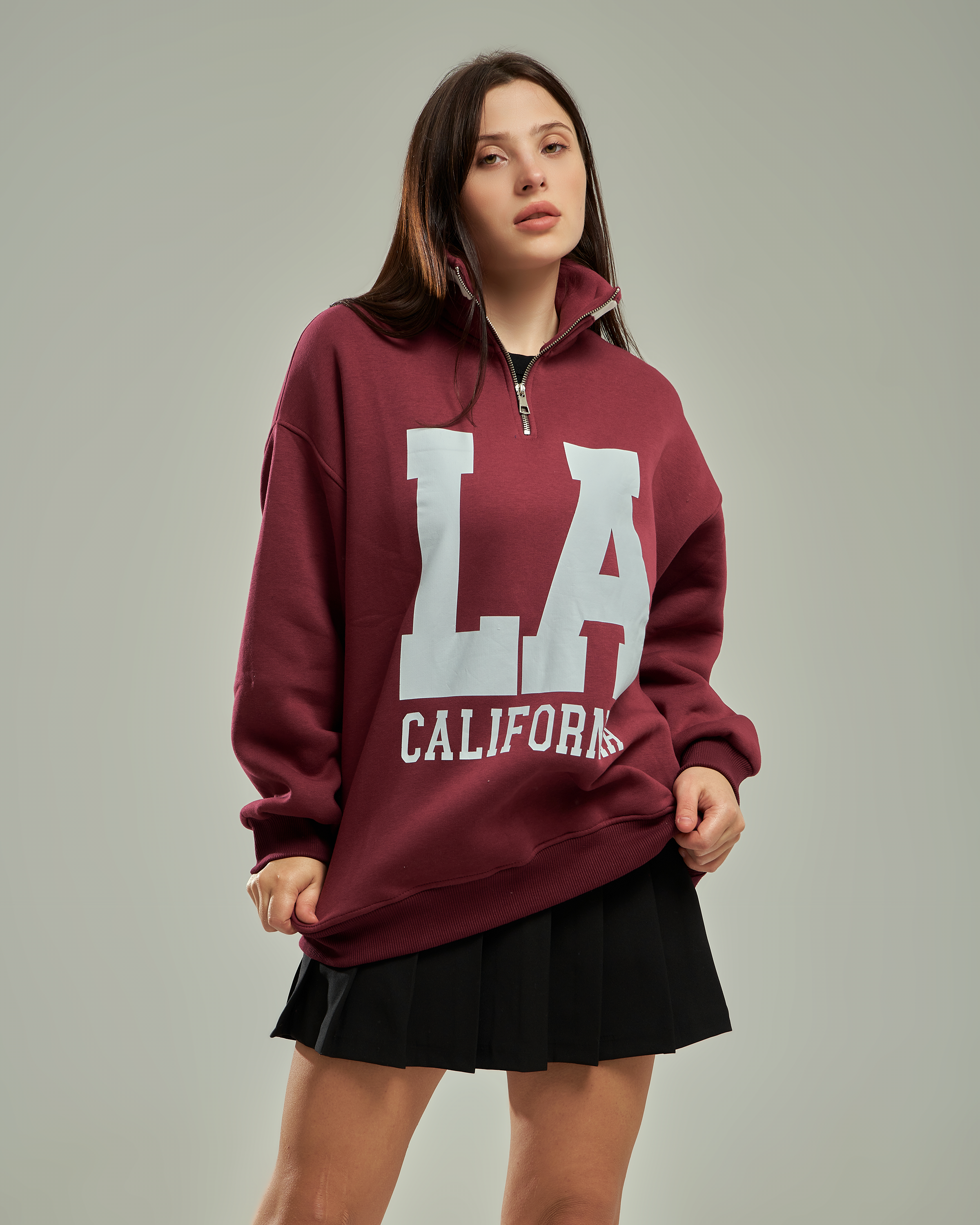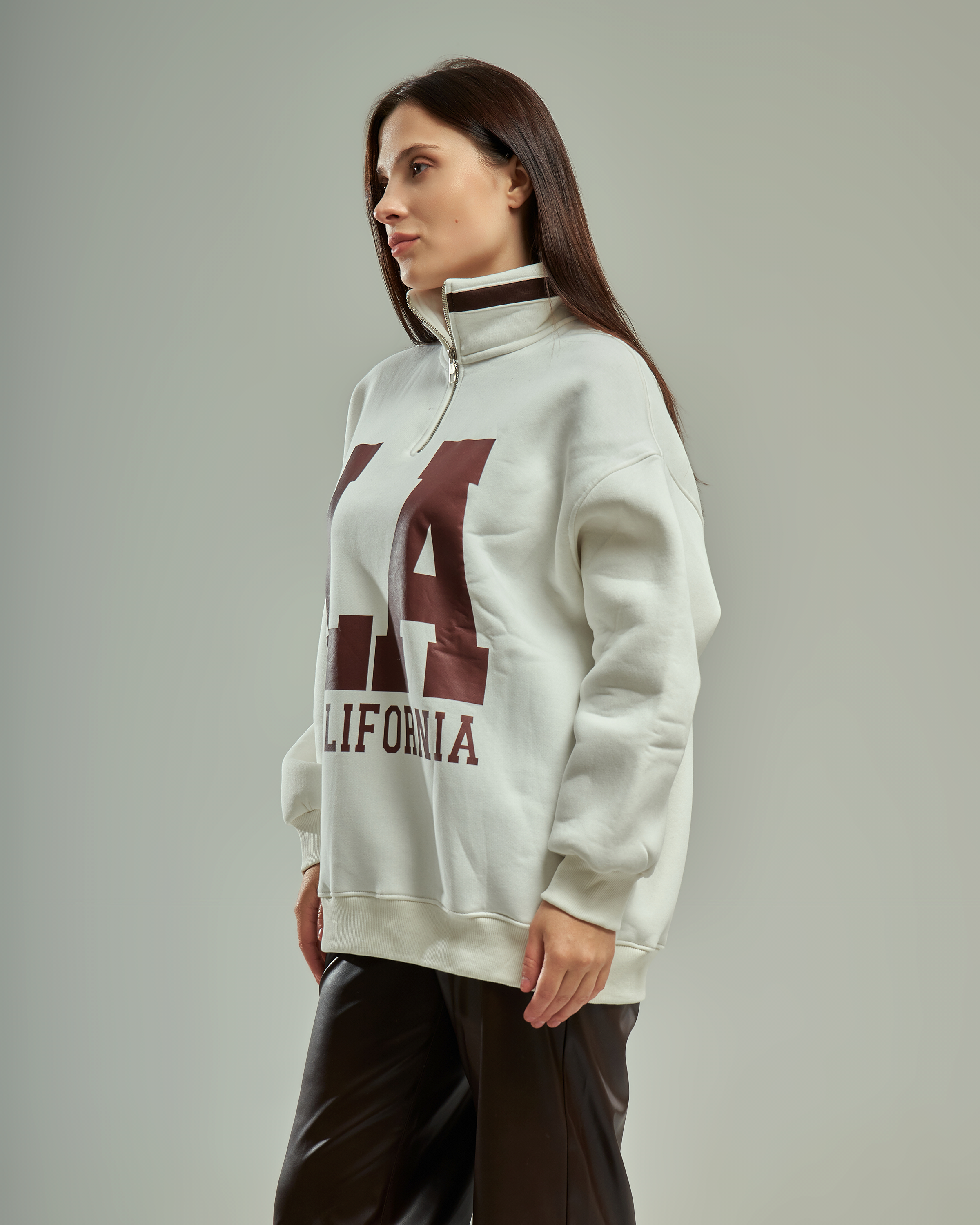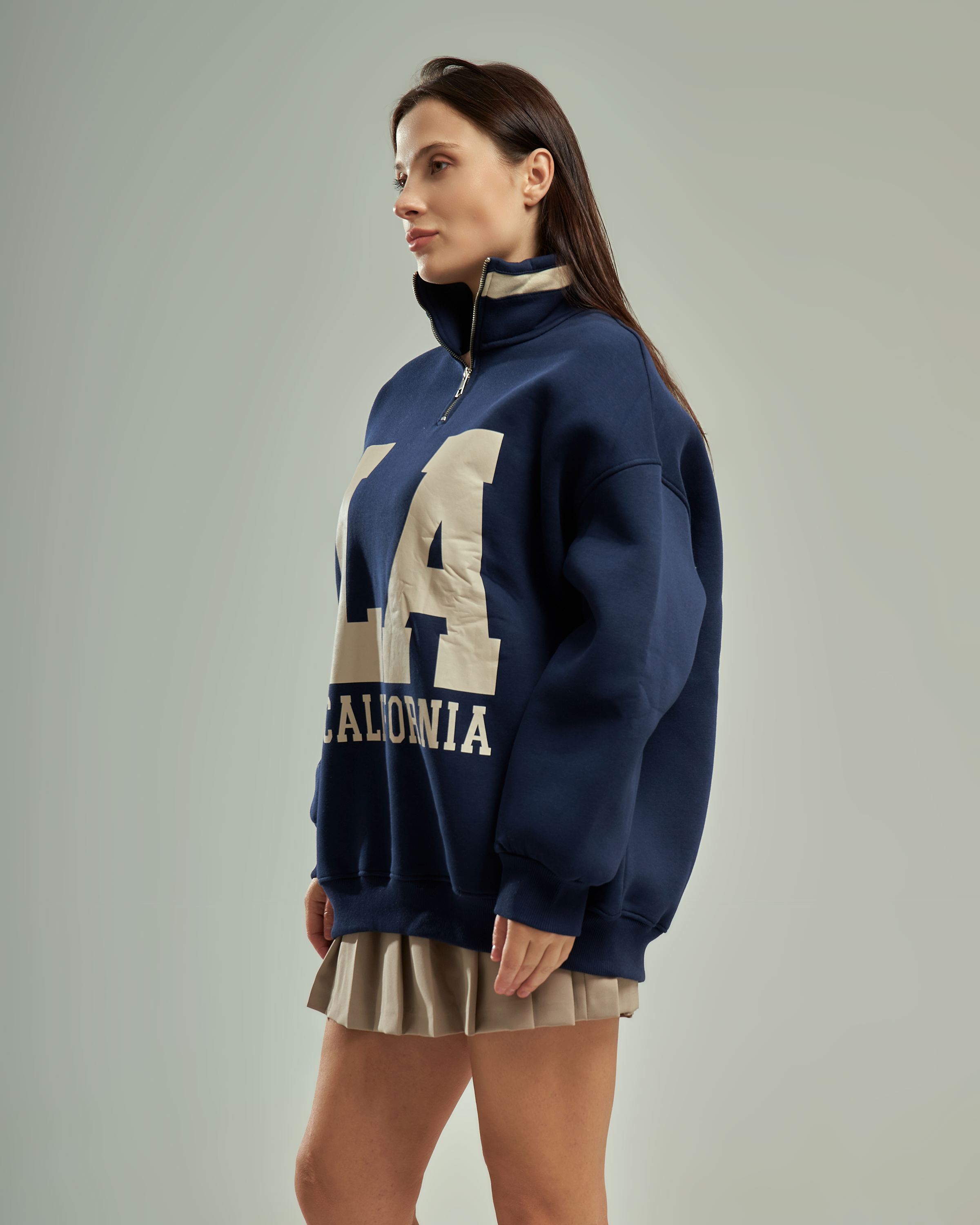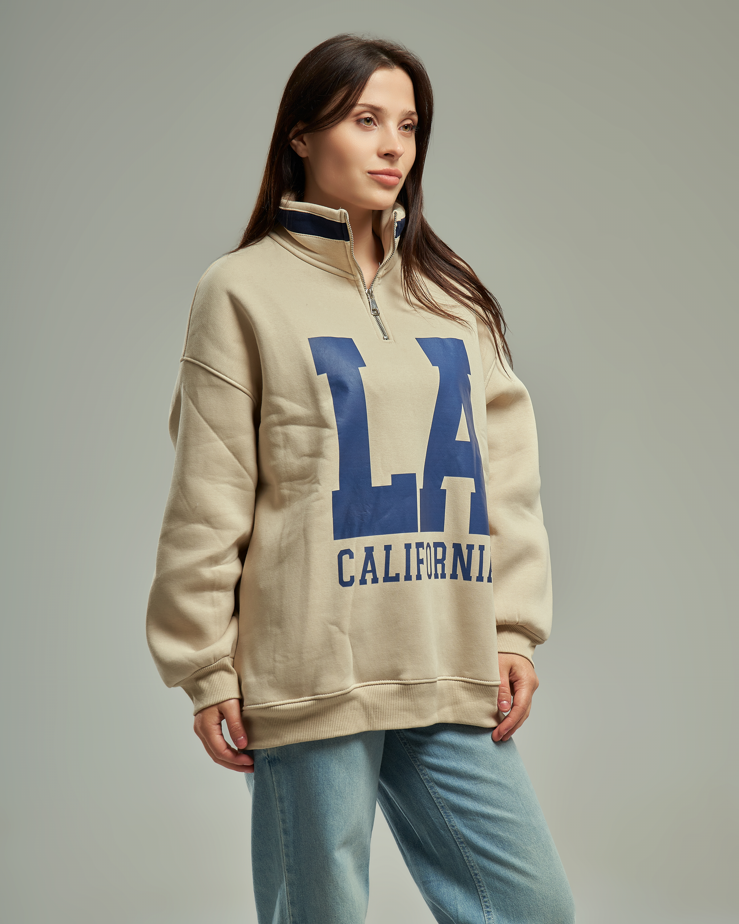 A premium oversized sweatshirt with a half-zip high collar and a bold "LA California" graphic. This one-size-fits-all piece is designed for a relaxed, trendy silhouette that provides ultimate comfort for daily wear.