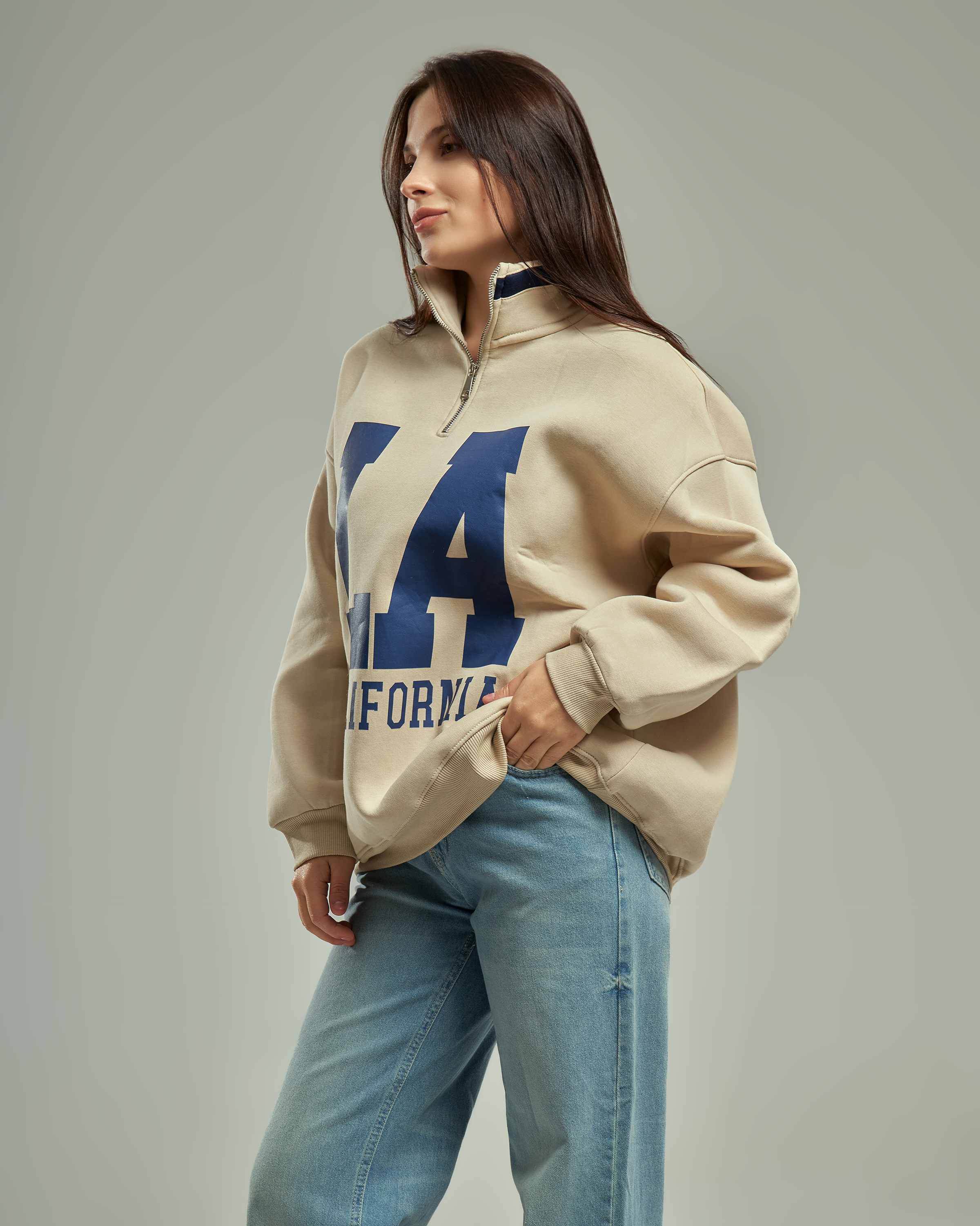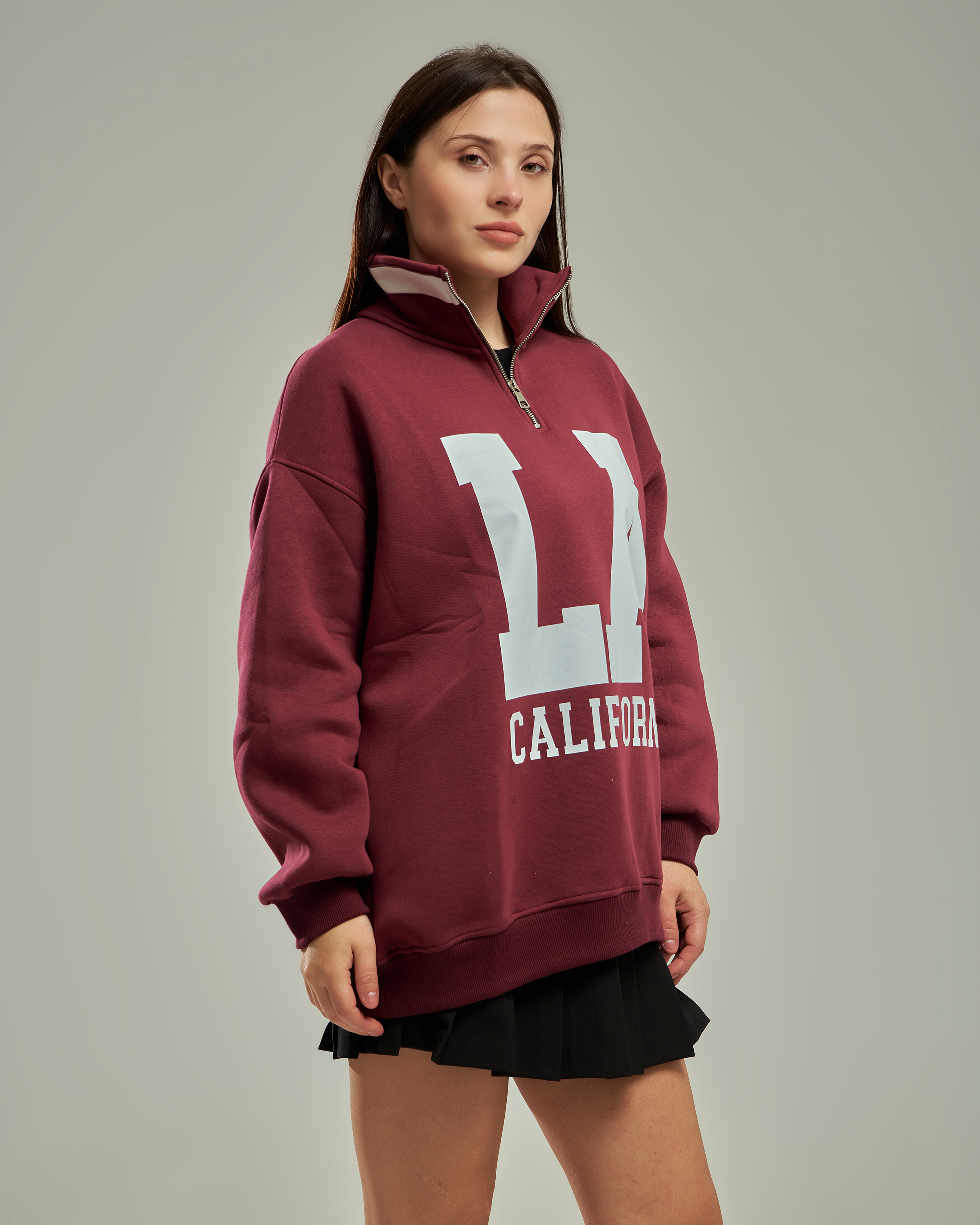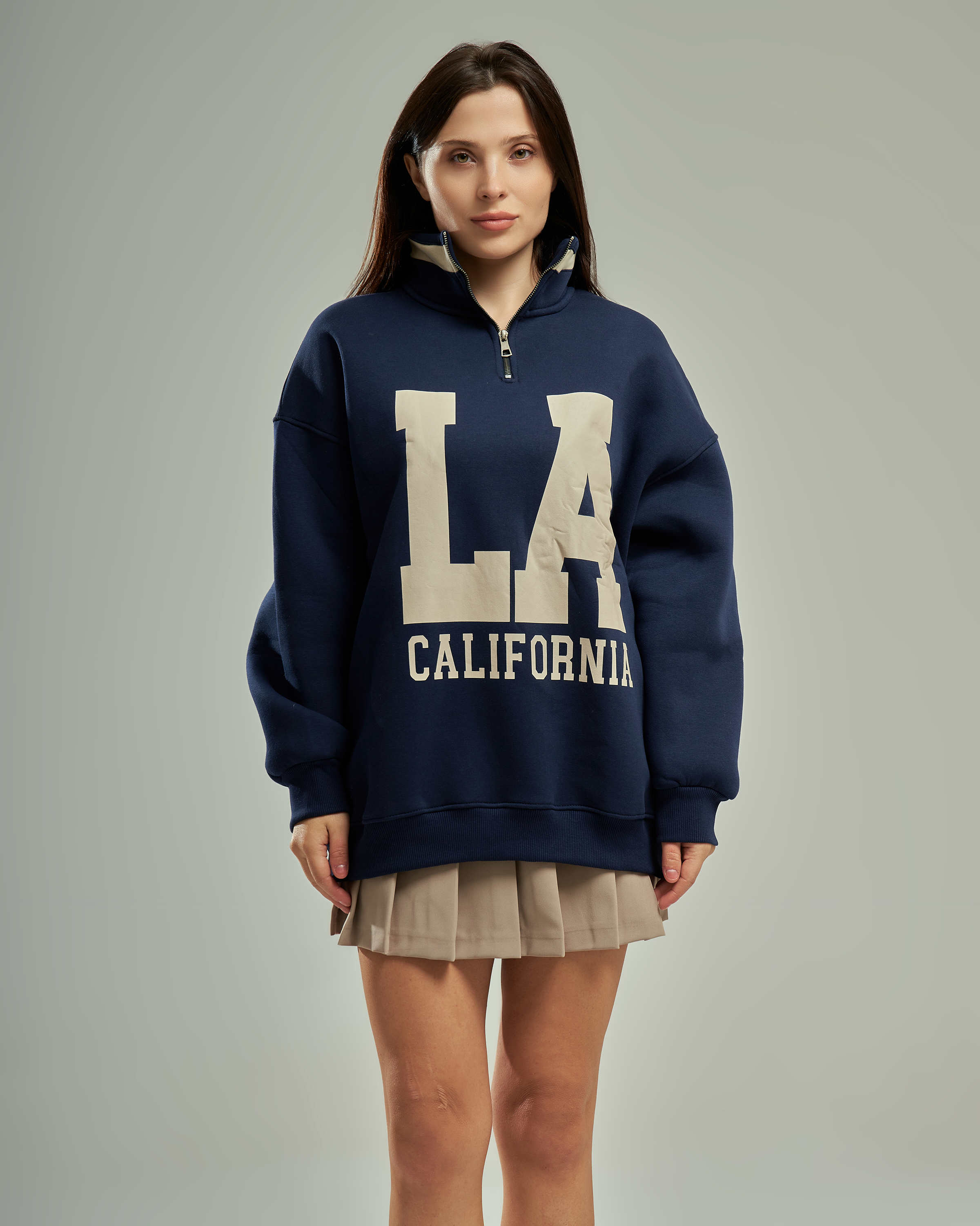 A premium oversized sweatshirt with a half-zip high collar and a bold "LA California" graphic. This one-size-fits-all piece is designed for a relaxed, trendy silhouette that provides ultimate comfort for daily wear.