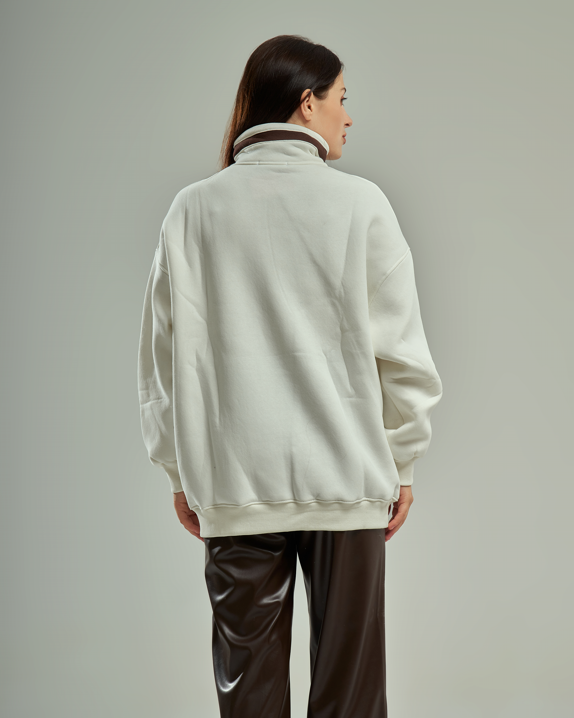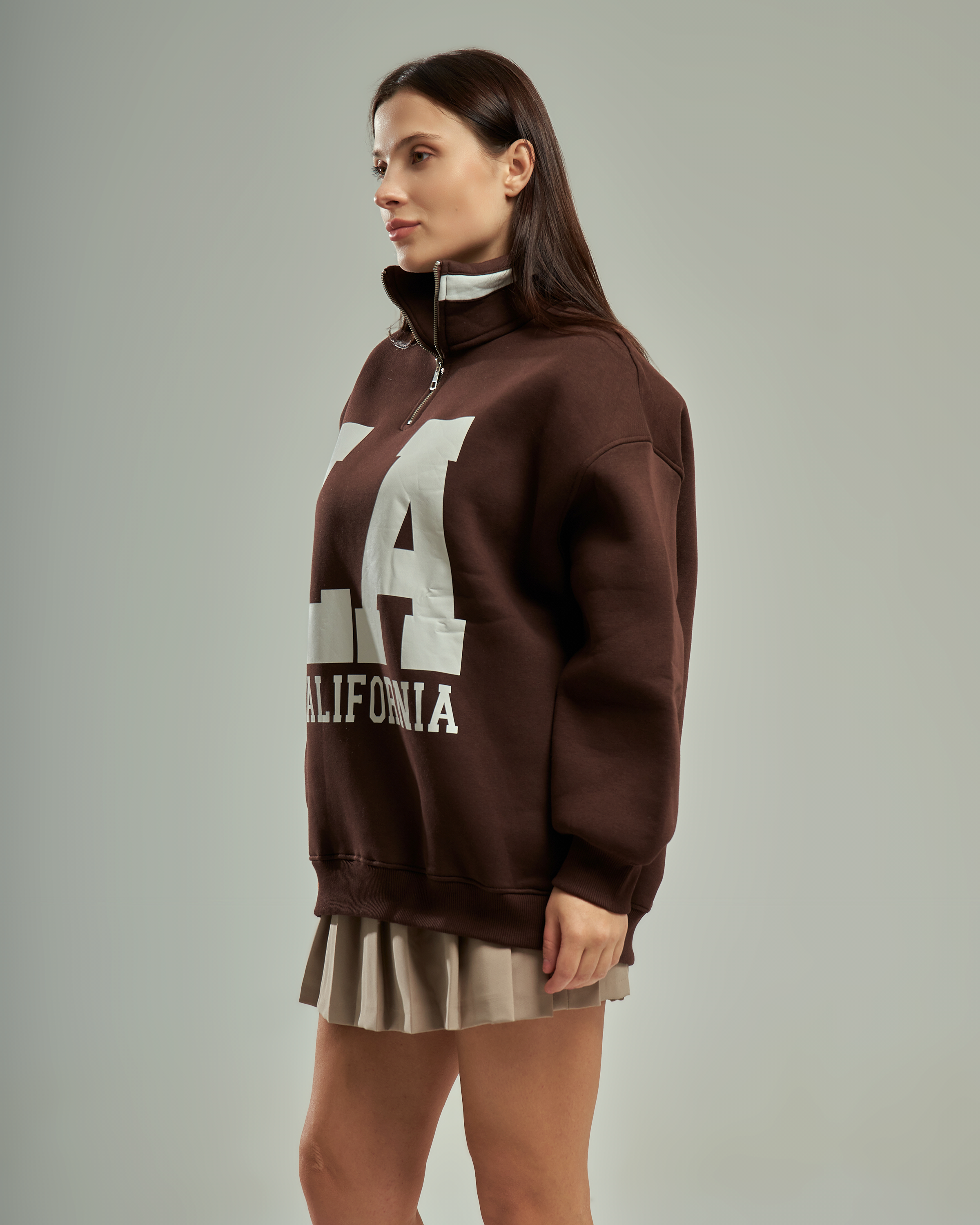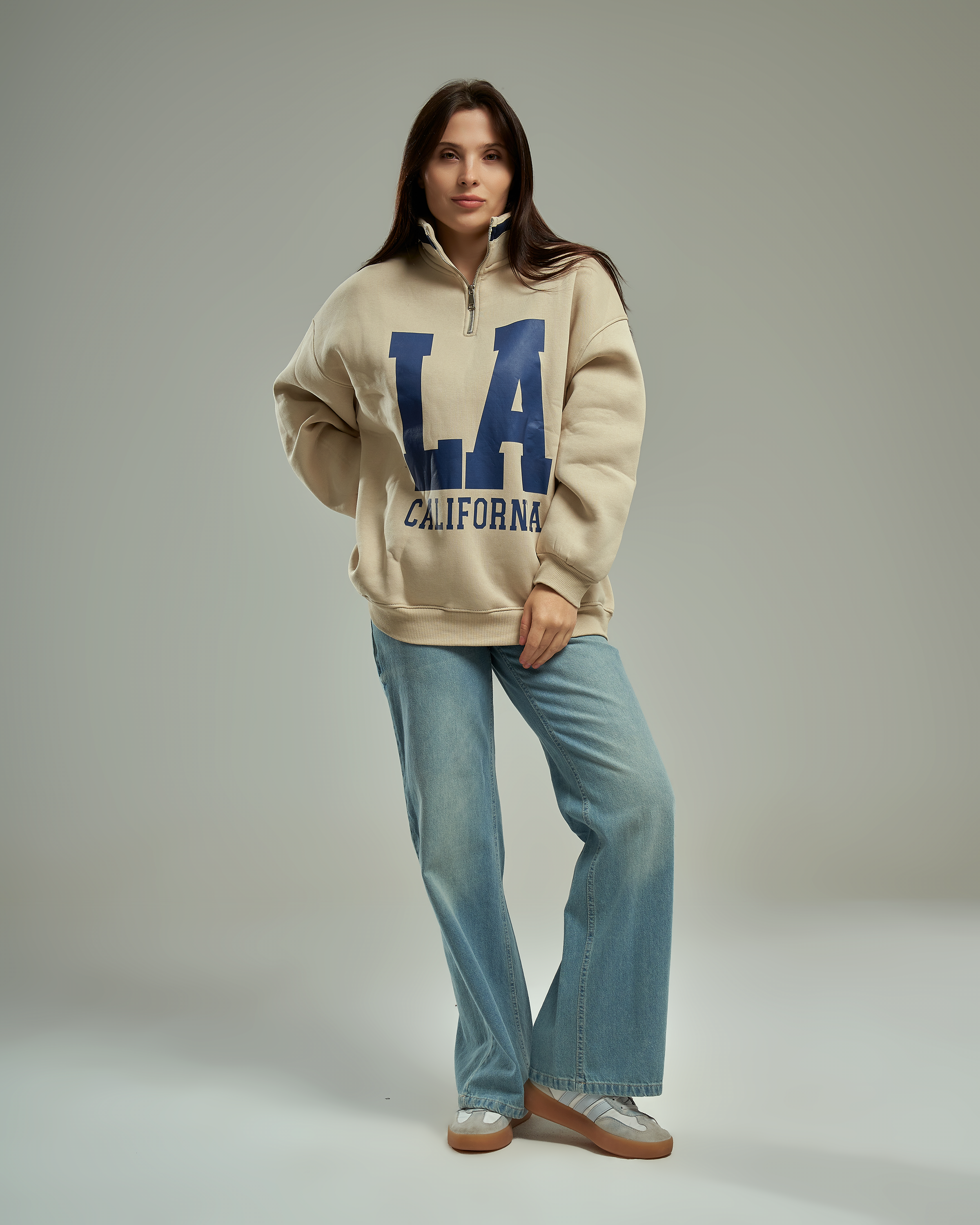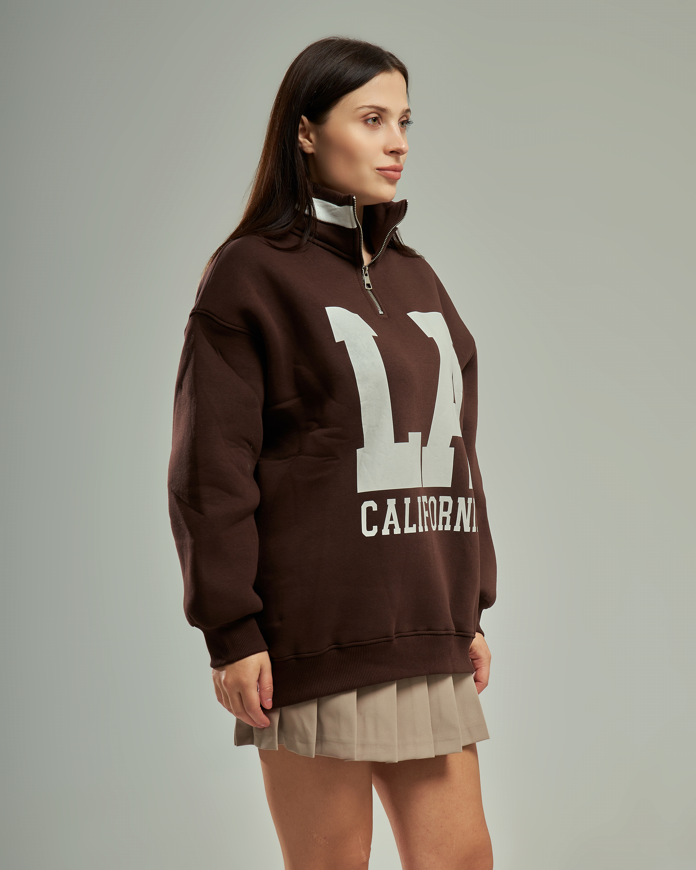 A premium oversized sweatshirt with a half-zip high collar and a bold "LA California" graphic. This one-size-fits-all piece is designed for a relaxed, trendy silhouette that provides ultimate comfort for daily wear.