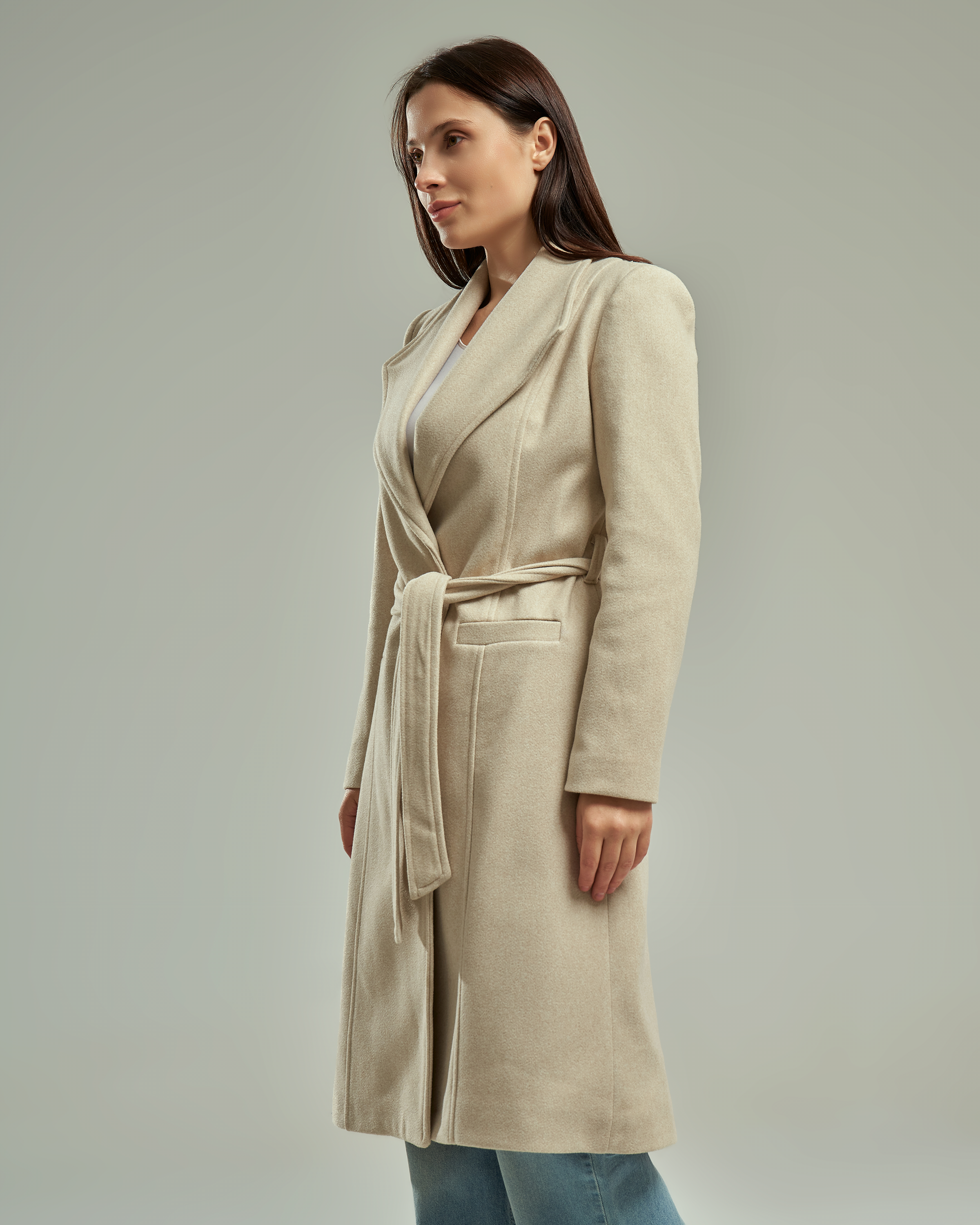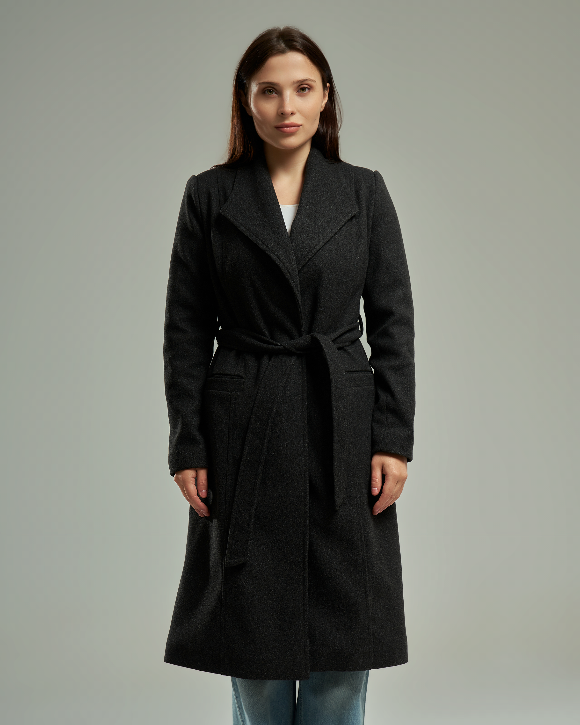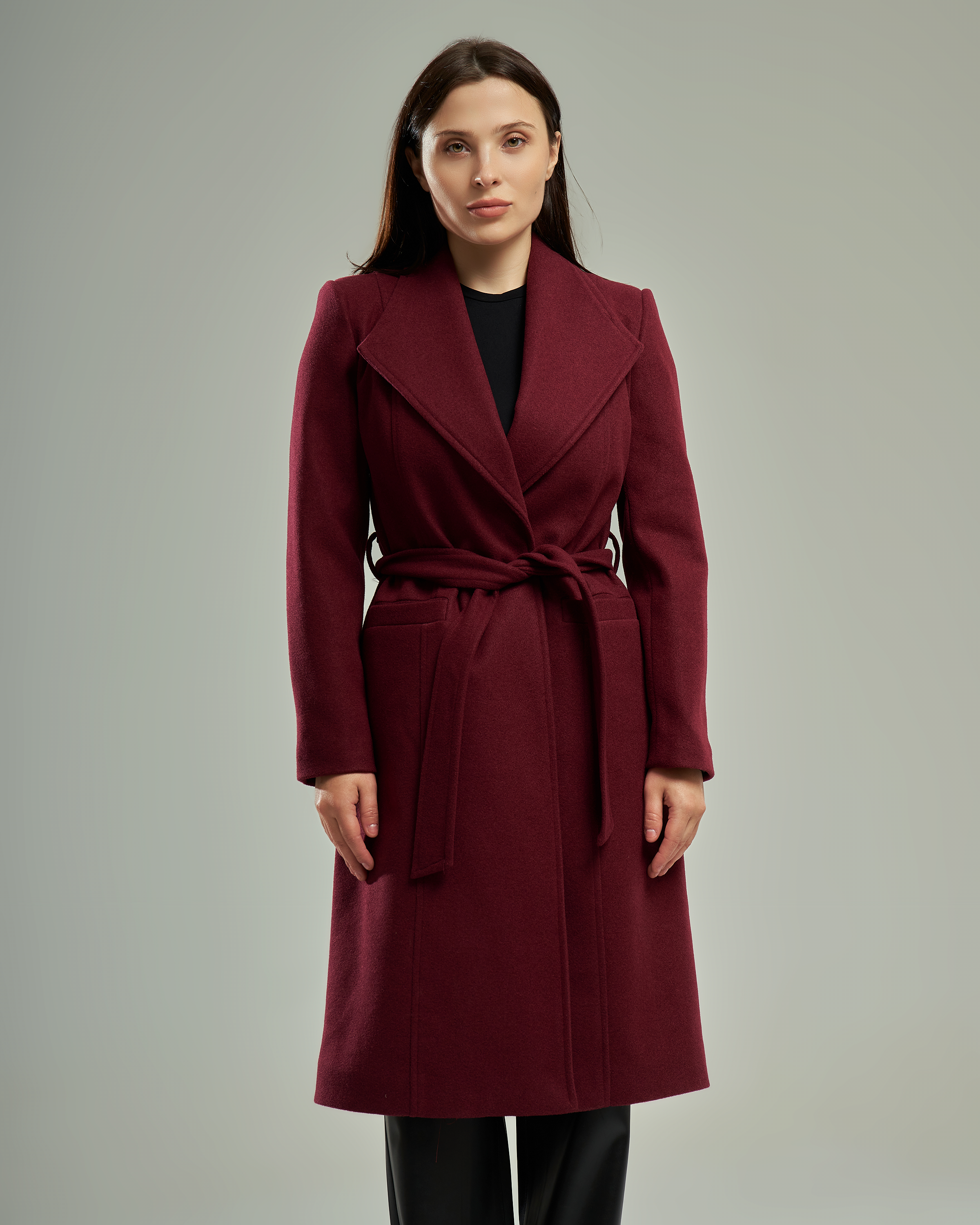 A long-line wool-blend coat featuring a wide notched lapel that creates a V-shaped neckline. The design includes a matching waist tie belt and two functional side pockets.