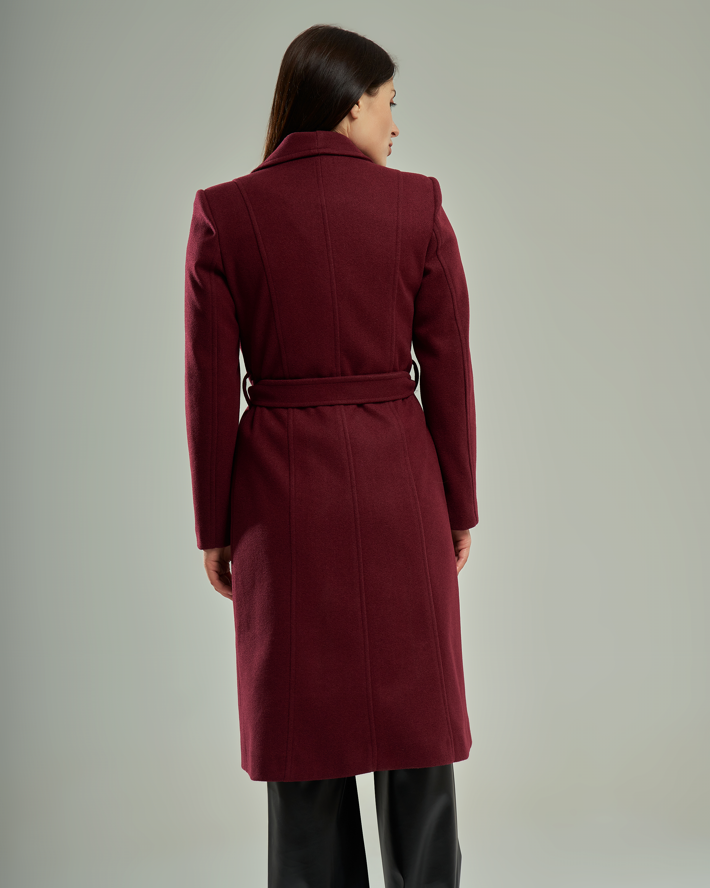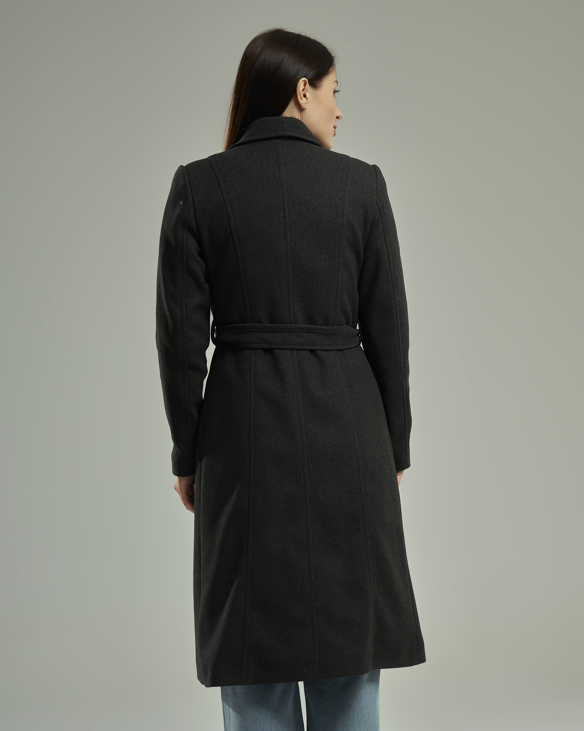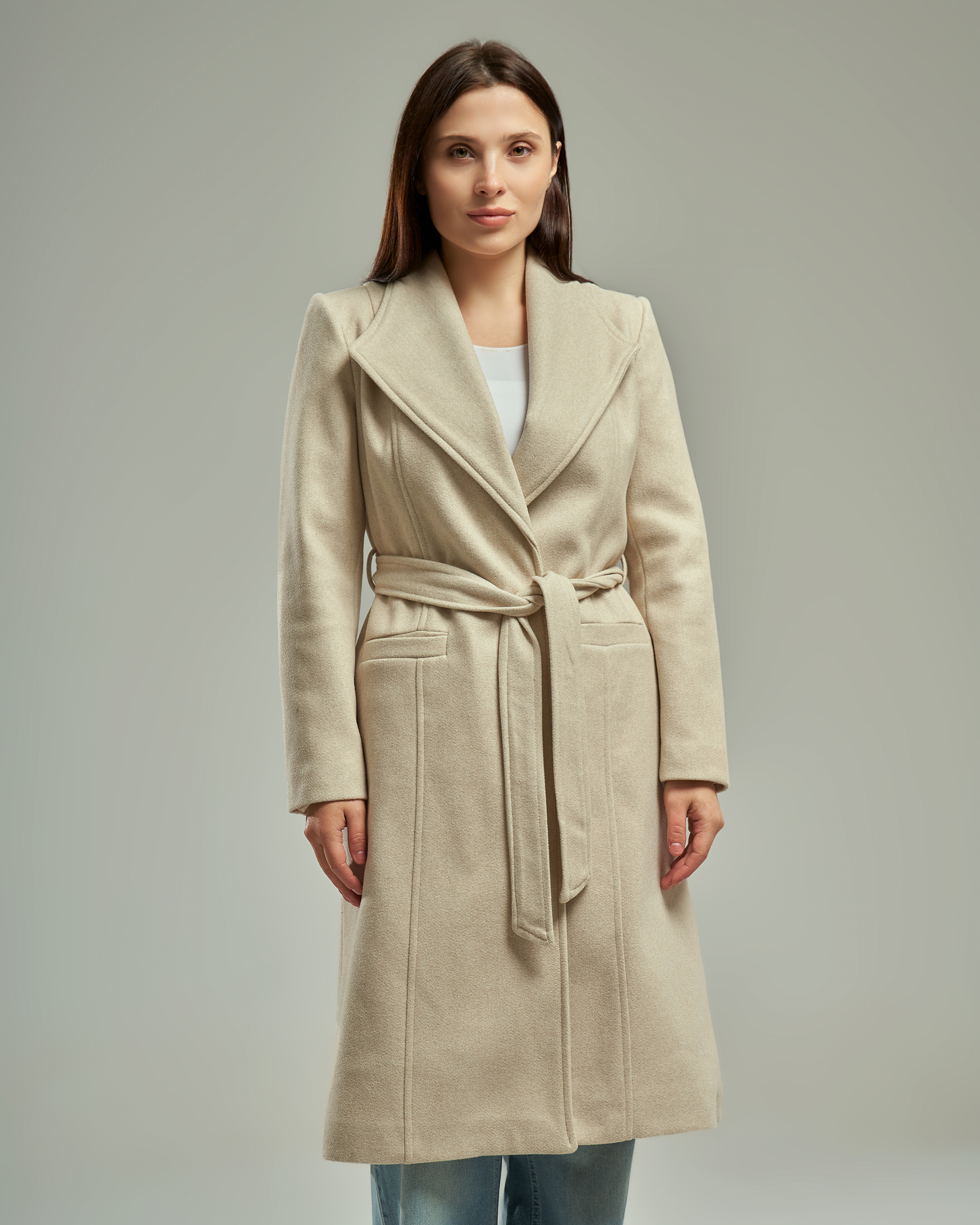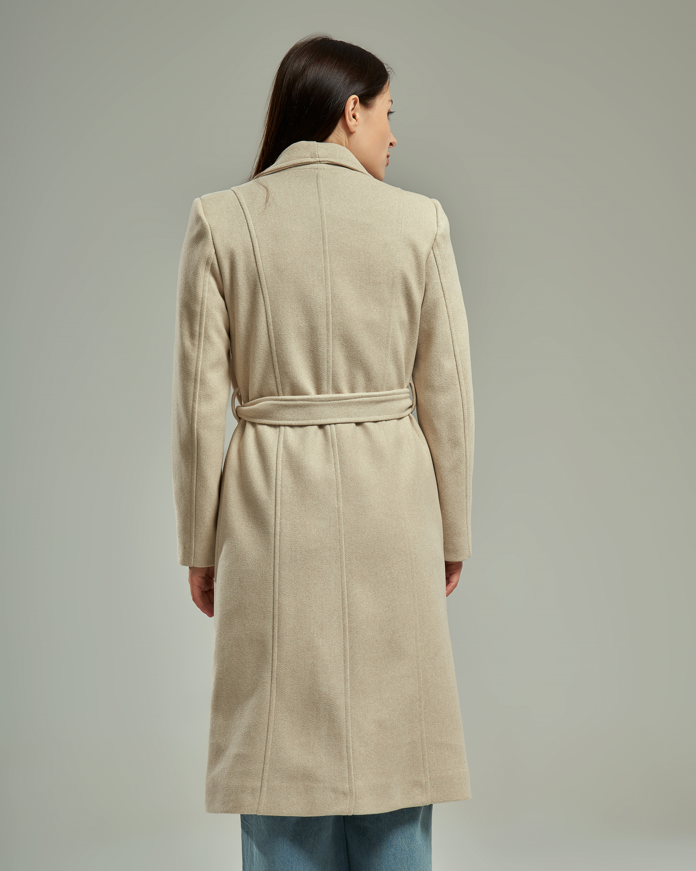 A long-line wool-blend coat featuring a wide notched lapel that creates a V-shaped neckline. The design includes a matching waist tie belt and two functional side pockets.